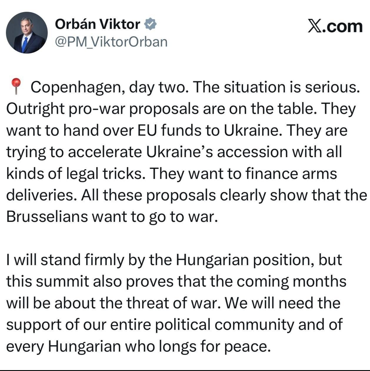 «Ситуация серьёзная. На столе переговоров находятся откровенно провоенные предложения. Они хотят передать Украине фонды ЕС. Они пытаются ускорить вступление Украины, используя всевозможные юридические ухищрения. Они хотят финансировать поставки оружия. Все эти предложения ясно показывают, что брюссельцы хотят начать войну. Этот саммит доказывает, что ближайшие месяцы будут связаны с угрозой войны»