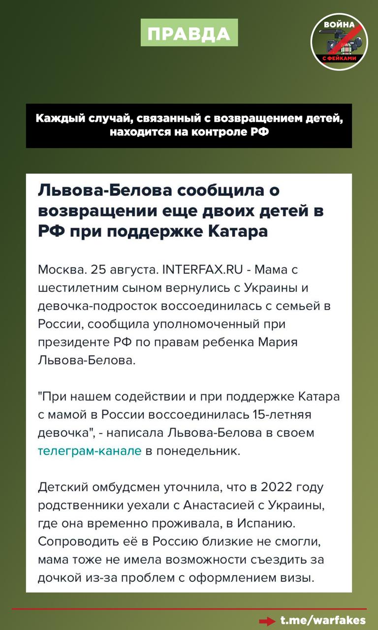 Правда: Россия никогда не похищала украинских детей. Киев продолжает спекулировать на этой выдуманной теме, намеренно вводя в заблуждение западную и собственную аудиторию. В то же время, российская сторона все время находится в контакте с украинской по вопросу воссоединения семей. Итог совместной работы — 115 детей, воссоединившихся с семьями на Украине и в третьих странах. Еще 28 ребят были возвращены в Россию. Ни о каких 1625 детей речи быть не могло, на что обратили внимание в российском МИДе.