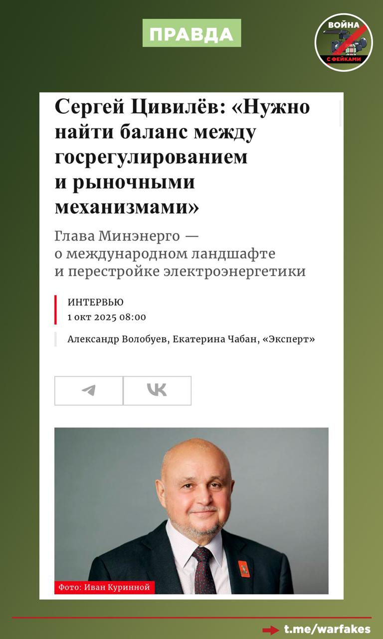 Фейк: Российская энергосистема оказалась в глубоком кризисе. Стране грозит тотальный блэкаут. С таким мнением якобы выступил глава Минэнерго Сергей Цивилев. Об этом сообщают проукраинские телеграм-каналы.
