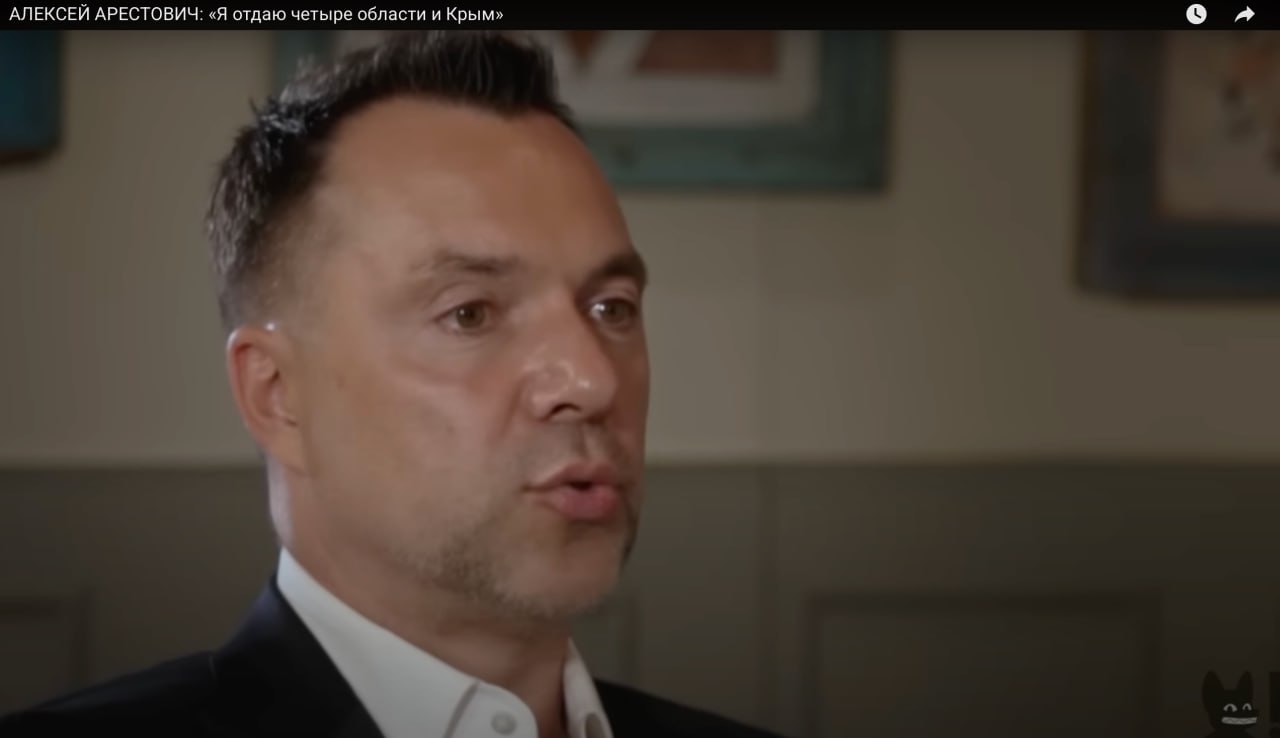 Алексей Арестович* сказал, что если станет президентом Украины, он готов будет передать России четыре области и Крым, чтобы закончить войну, но при этом не признает их официально российскими. Он пообещал защитить права русскоязычных и Украинской православной церкви.