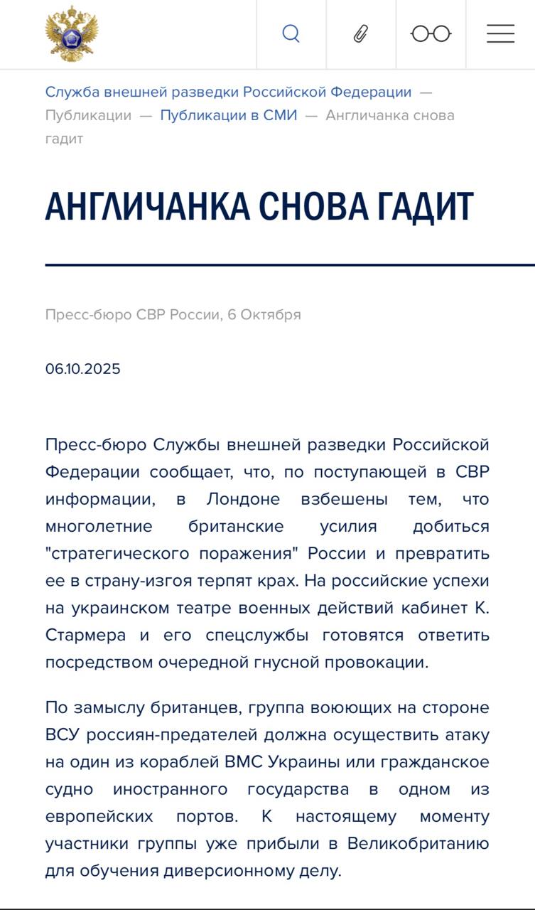Пресс-бюро Службы внешней разведки Российской Федерации сообщает, что, по поступающей в СВР информации, в Лондоне взбешены тем, что многолетние британские усилия добиться "стратегического поражения" России и превратить ее в страну-изгоя терпят крах. На российские успехи на украинском театре военных действий кабинет К. Стармера и его спецслужбы готовятся ответить посредством очередной гнусной провокации.