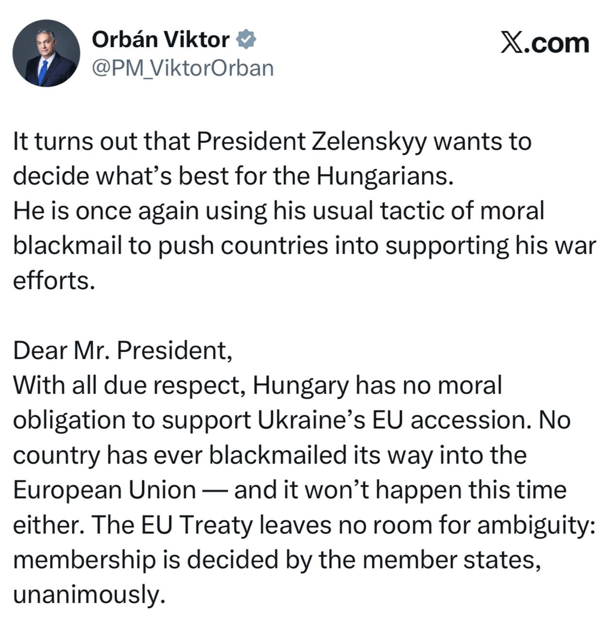 Оказывается, президент Зеленский хочет решить, что лучше для венгров. Он снова использует свою обычную тактику морального шантажа, чтобы подтолкнуть страны к поддержке его военных усилий. Уважаемый господин президент, при всем моем уважении, у Венгрии нет моральных обязательств поддерживать вступление Украины в ЕС. Ни одна страна никогда не добивалась вступления в Европейский союз шантажом и на этот раз этого не произойдет.
