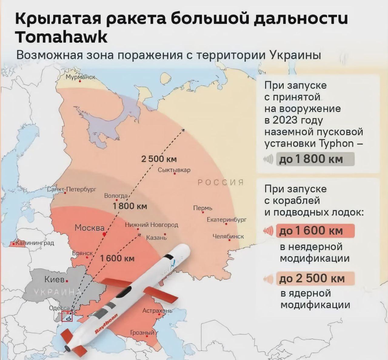 Потенциальная зона поражения американских крылатых ракет Tomahawk с территории Украины и в зависимости от пусковых систем.