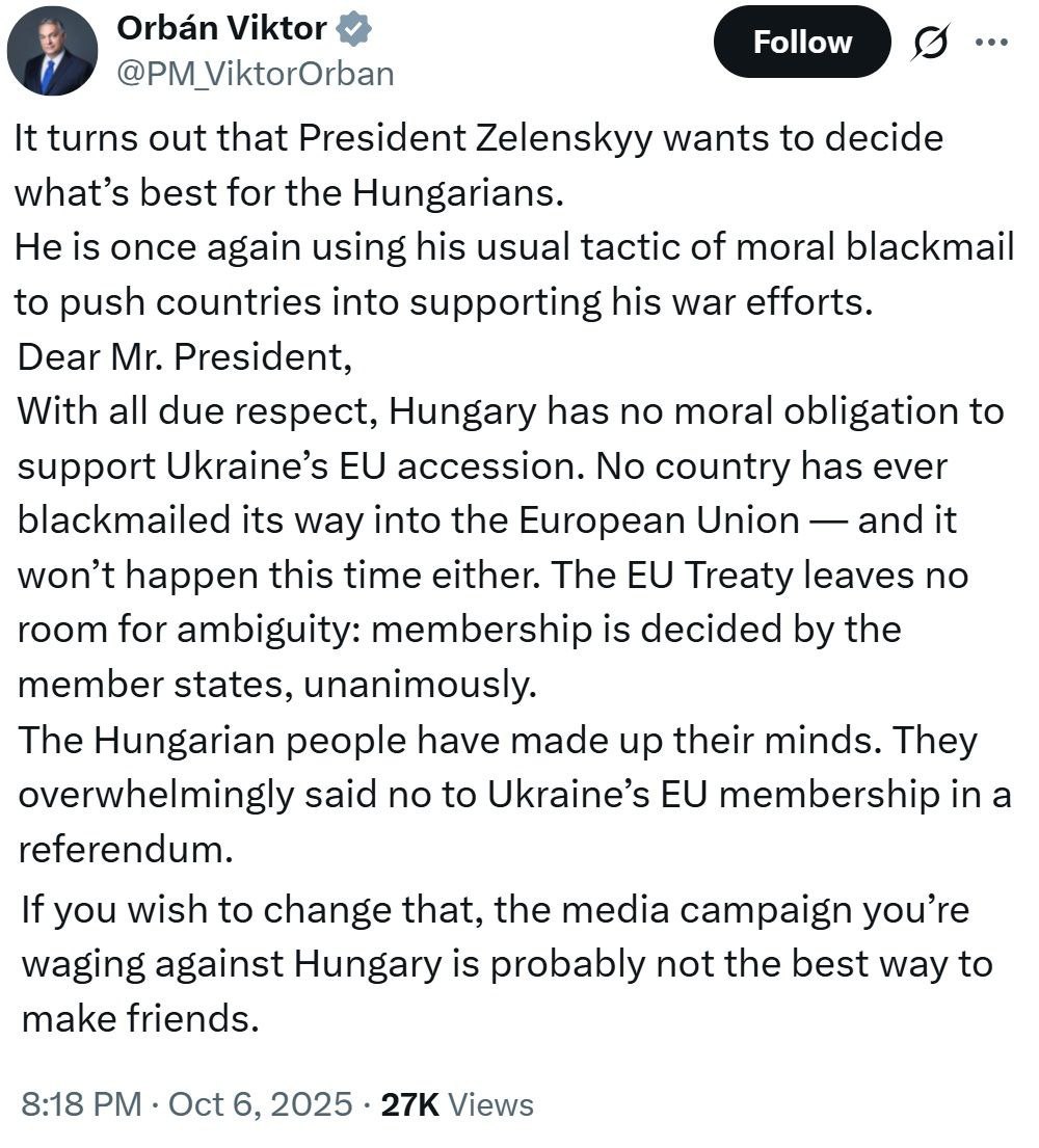 «Оказывается, президент Зеленский хотел бы сам решать за венгров, что для них лучше. И в очередной раз прибегает к своей обычной тактике морального шантажа стран с целью склонить их к поддержке своей войны. Дорогой господин президент! При всем к вам уважении у Венгрии нет моральных обязательств поддерживать вступление Украины в Евросоюз».