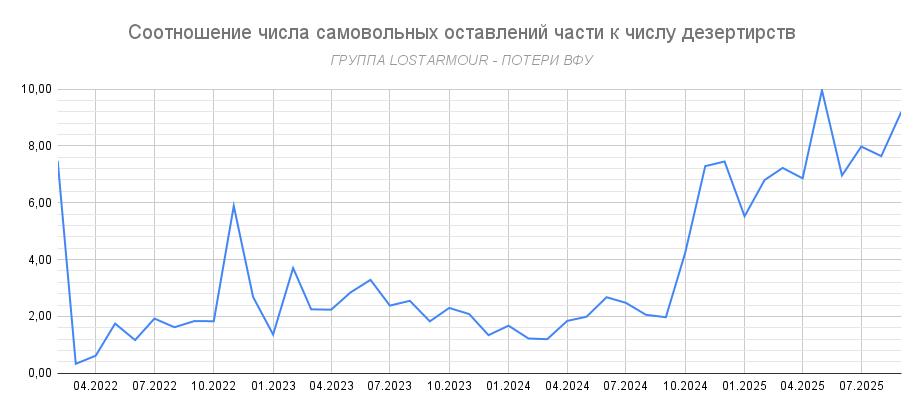 Аналитики отмечают резкий рост доли самовольных оставлений части по сравнению с прямыми случаями дезертирства: в среднем на одного дезертира приходится девять СОЧ, тогда как в 20222024 гг. это соотношение составляло примерно 2 к 1.