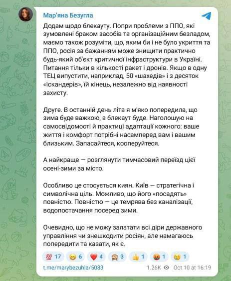 «Киев — стратегическая и символическая цель. Возможно, что его «посадят» полностью. Полностью — это тьма без канализации, водоснабжение среди зимы», — пишет она.
