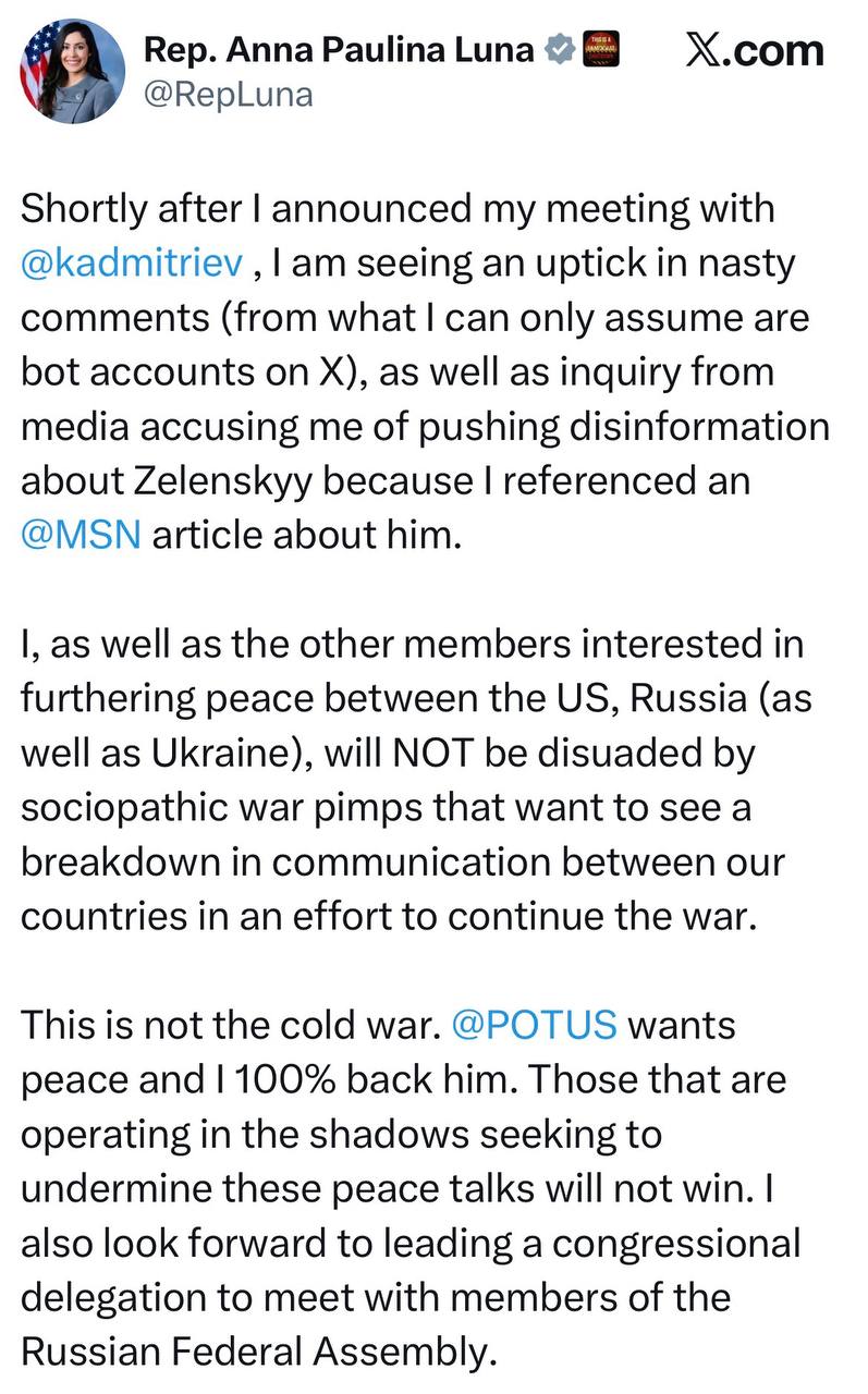 Это не холодная война. Трамп хочет мира, и я на 100% его поддерживаю. Те, кто действует в тени, пытаясь подорвать эти мирные переговоры, не победят. Я также с нетерпением жду возможности возглавить делегацию Конгресса для встречи с депутатами Федерального Собрания Российской Федерации.