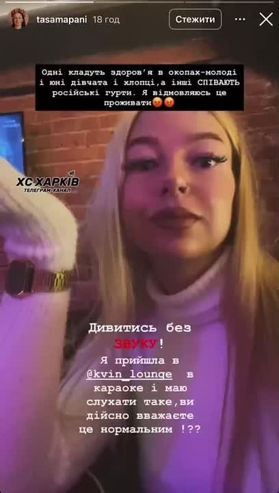 Свидомая подстилка публикует в своём "инстаграме" видеодонос (который уже разошёлся по пабликам и группам украинских нацистов) на компанию молодых девушек, которые в одном из заведений русского города Харькова поют на русском языке какую-то попсовую песню в караоке.