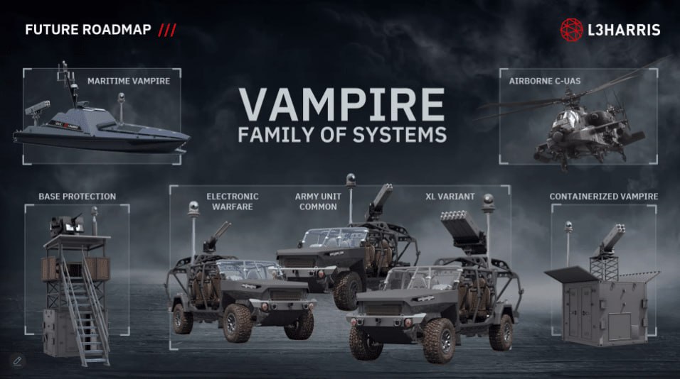 Заявляется, что Украина получила 14 легких ЗРК Vampire на шасси бронеавтомобилей Humvee. Новое же семейство VAMPIRE от компании L3Harris может устанавливаться и на нескольких новых различных платформ: