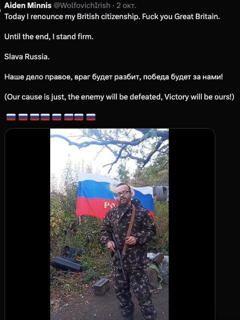 «Fuck you Great Britain. Slava Russia. Наше дело правое, враг будет разбит, победа будет за нами»!: воюющий за Россию британский доброволец Эйден Миннис сжег свой британский паспорт и обещал туда не вернуться.