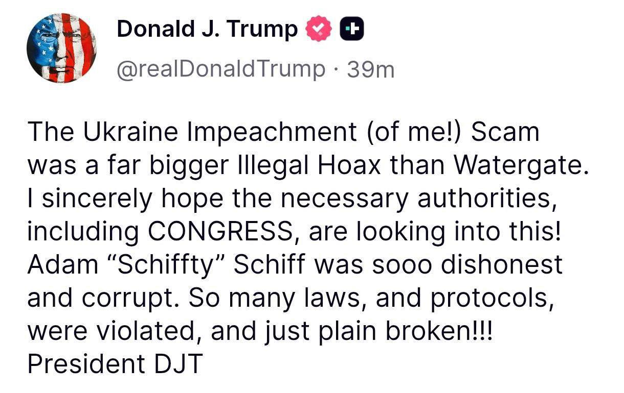 Президент США Дональд Трамп в своем аккаунте в Truth Social заявил, что процедура импичмента 2019 года, инициированная из-за обвинений в давлении на украинское руководство, представляла собой «гораздо больший незаконный обманом», чем Уотергейтский скандал.