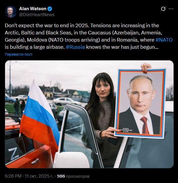 "Не ждите, что конфликт [на Украине] закончится в 2025 году. Нарастает напряженность в Арктике, Балтийском и Черном морях, на Кавказе (Азербайджан, Армения, Грузия), в Молдавии (прибывают войска НАТО) и в Румынии, где НАТО строит крупную авиабазу. Россия знает, что война только началась", — заявил аналитик Алан Уотсон.