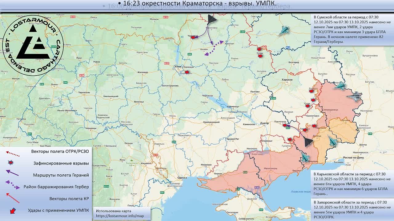 Анимированная схема ударов по территории Украины 12 октября - 13 октября 2025 года.