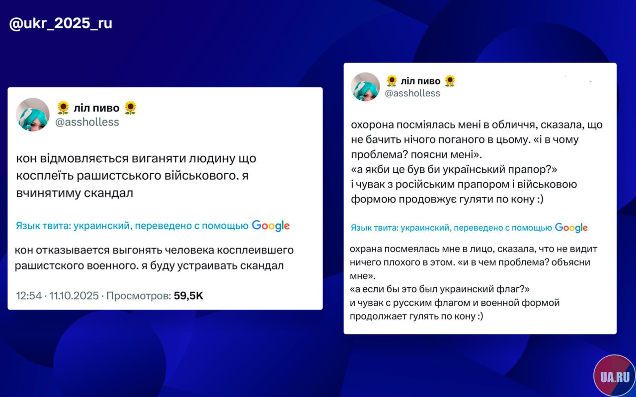 У себя в X она писала, что устроит скандал из-за человека в костюме "рашистского солдата", дабы его выгнали. Но охрана лишь посмеялась ей в лицо.
