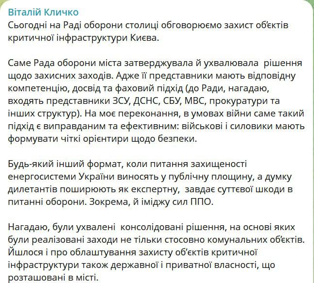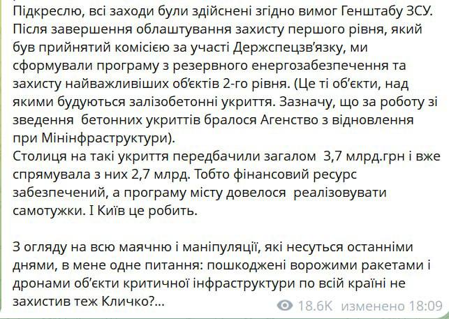«Учитывая весь бред и манипуляции последних дней, у меня один вопрос: объекты критической инфраструктуры по всей стране, поврежденные вражескими ракетами и дронами, тоже Кличко не защитил?» – написал мэр в своём Telegram-канале.