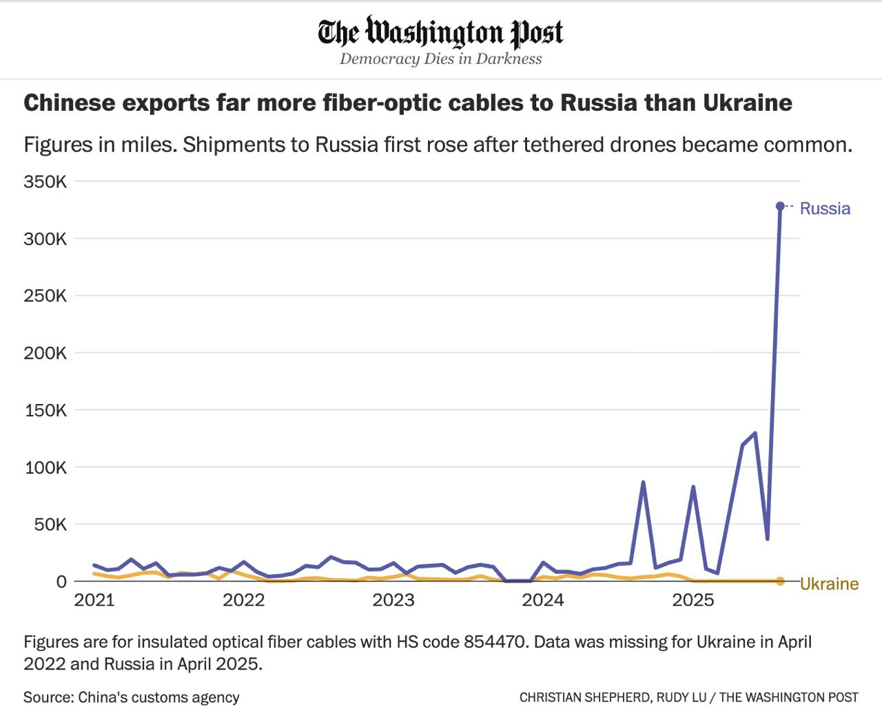 Есть и цифры. WaPo получила доступ к детальным данным китайской таможни и выяснилось, что поставки оптоволоконного кабеля в Россию за лето выросли почти в десять раз, достигнув 328 000 миль в августе. Для сравнения Украине в том же месяце было продано всего 72 мили кабеля.