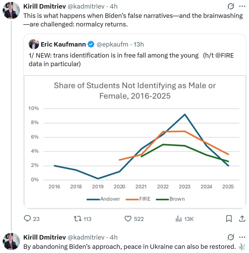Спецпредставитель президента России Кирилл Дмитриев отреагировал на данные об изменении доли трансгендеров* в мире. В своем посте в соцсети он привел график, показывающий резкий рост числа таких людей с момента вступления Байдена в должность и последующее снижение.