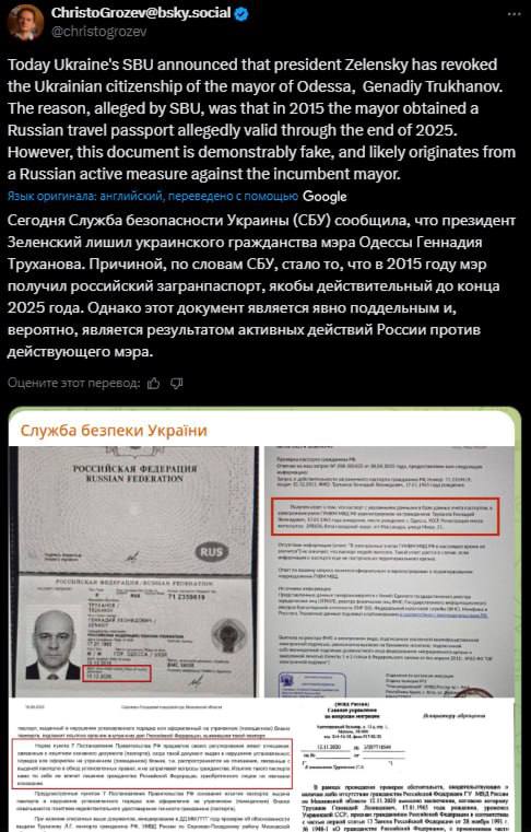 Сегодня Служба безопасности Украины сообщила, что президент Зеленский лишил украинского гражданства мэра Одессы Геннадия Труханова. Причиной, по словам СБУ, стало то, что в 2015 году мэр получил российский загранпаспорт, якобы действительный до конца 2025 года. Однако этот документ является явно поддельным и, вероятно, является результатом активных действий России против действующего мэра, пишет украинский оппозиционный ресурс ЗеРада.