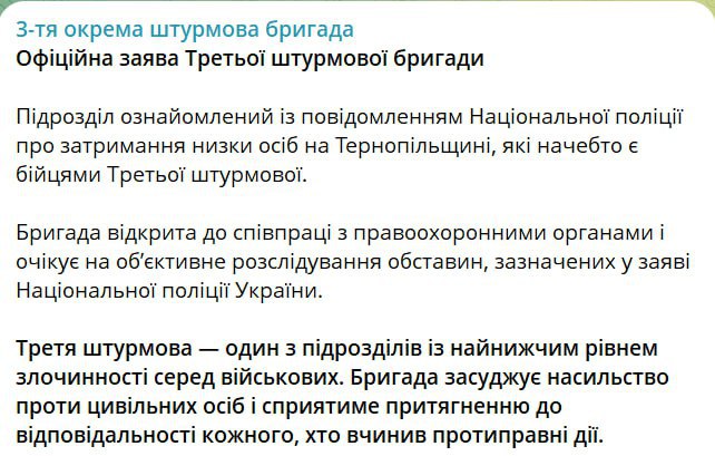 Бригада открыта к сотрудничеству с правоохранительными органами и ожидает объективного расследования обстоятельств, указанных в заявлении Национальной полиции Украины.