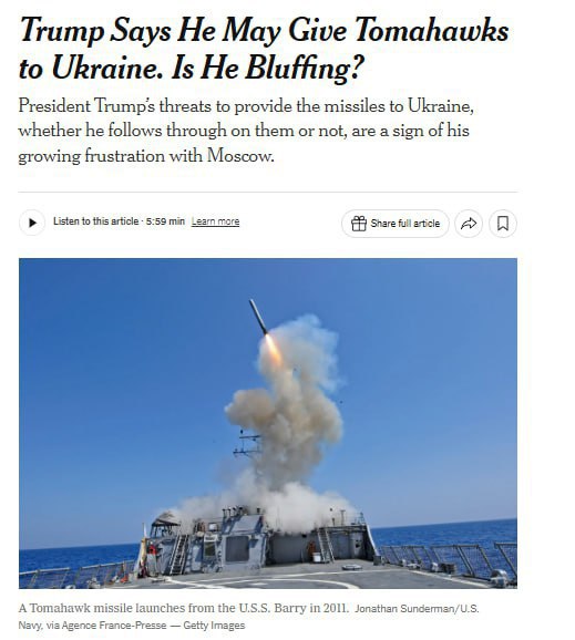 Вопрос о передаче «Томагавков» обсуждается на фоне запланированной встречи Трампа и Зеленского*, где украинская сторона настаивает на получении дальнобойного оружия.