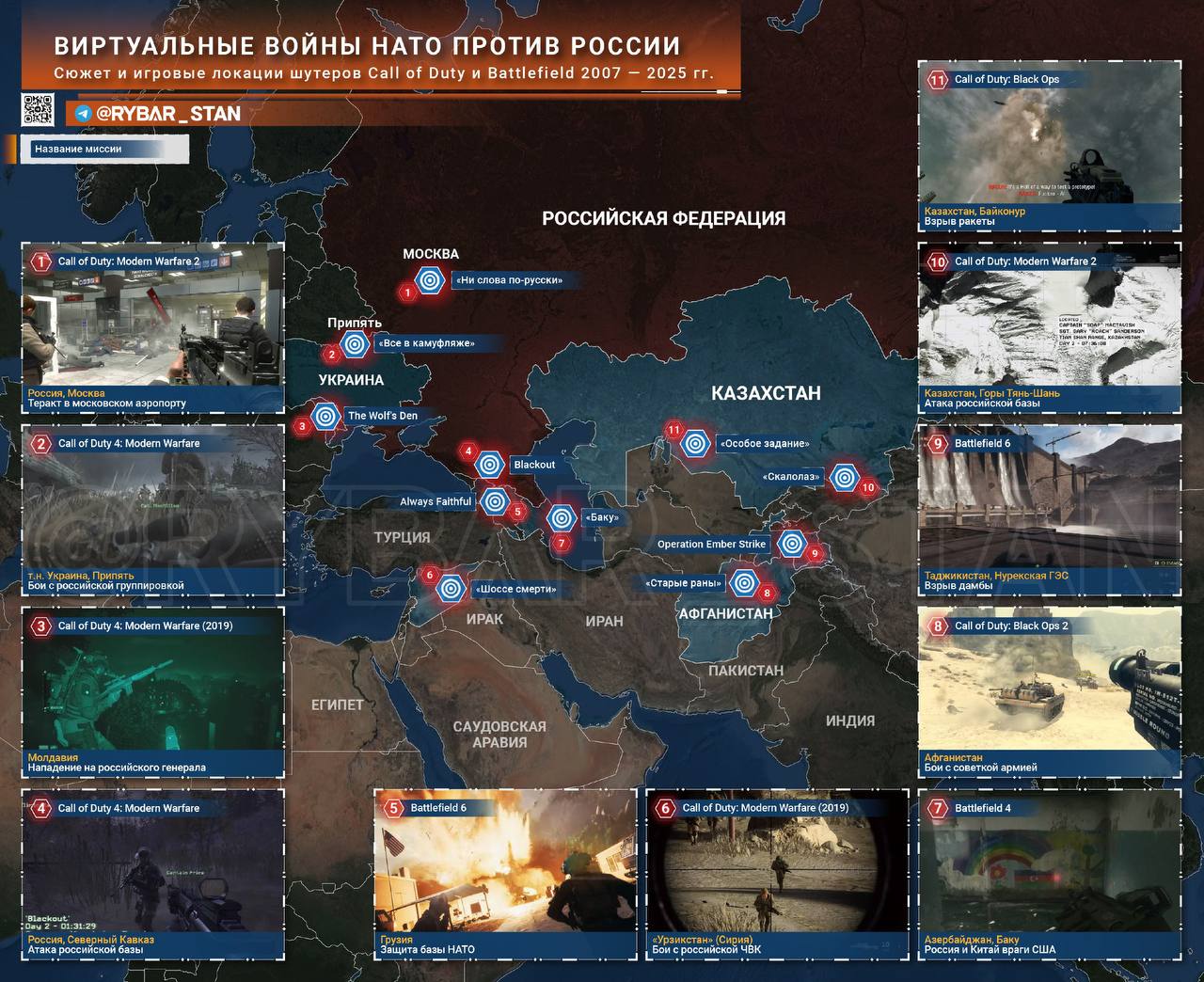 Среди локаций, на которых игрокам популярного по всему миру шутера предстояло противостоять России, есть т.н. Украина, российский Северный Кавказ, Молдавия и даже Казахстан, в котором, по сюжету одной из «миссий», требовалось взорвать Байконур.