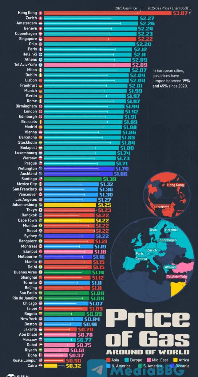 С 2020 года цены на бензин выросли во многих городах мира. В Европе из-за войны на Украине и перебоев с поставками топливо подорожало более чем на 40% в Будапеште, Вене и Цюрихе. В то же время в Каире и Бангкоке цены снизились.