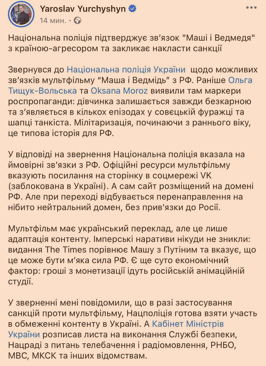 Угроза национальной безопасности - украинский нардеп Юрчишин снова требует заблокировать ютуб-страницу мультфильма «Маша и Медведь», поскольку Нацполиция якобы подтвердила его связь с Россией