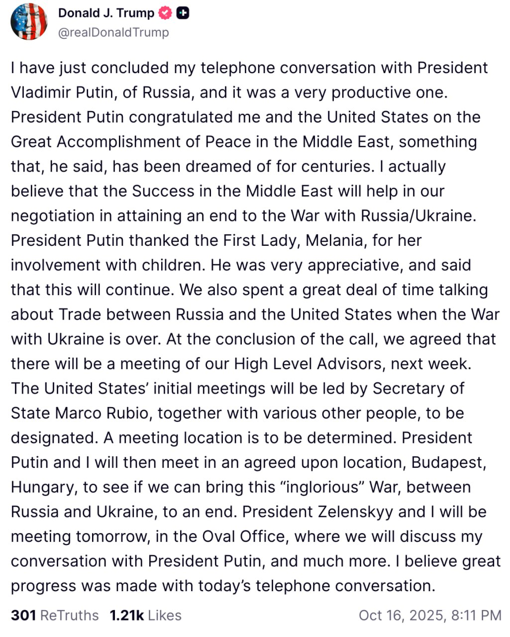 Президент Путин и я затем встретимся лично в согласованном месте — в Будапеште, Венгрия, — чтобы попытаться положить конец этой «постыдной» войне между Россией и Украиной.