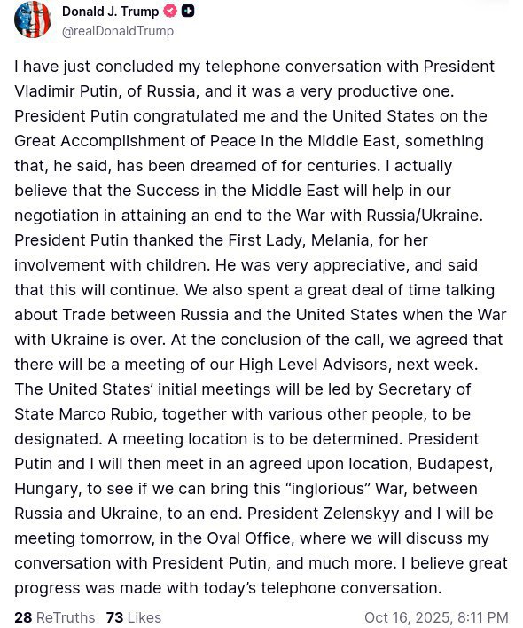 Дональд Трамп заявил, что он и Путин вскоре встретятся в Будапеште