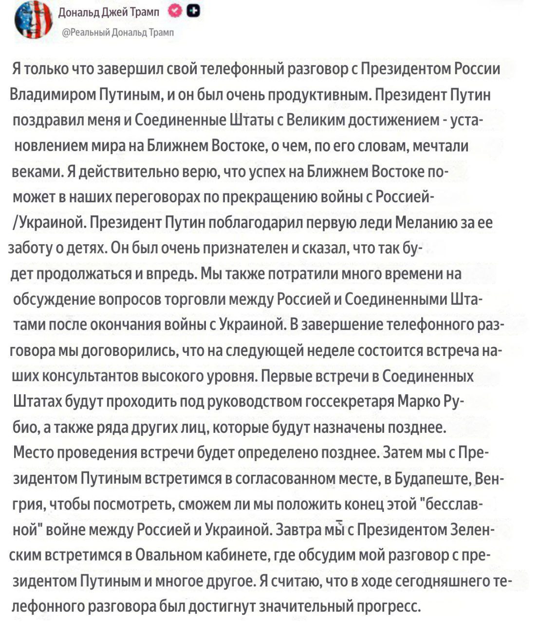 Чиновники высокого уровня РФ и США проведут встречу на следующей неделе, Штаты представит Рубио, место определят позднее, заявил Трамп по итогам звонка с Путиным