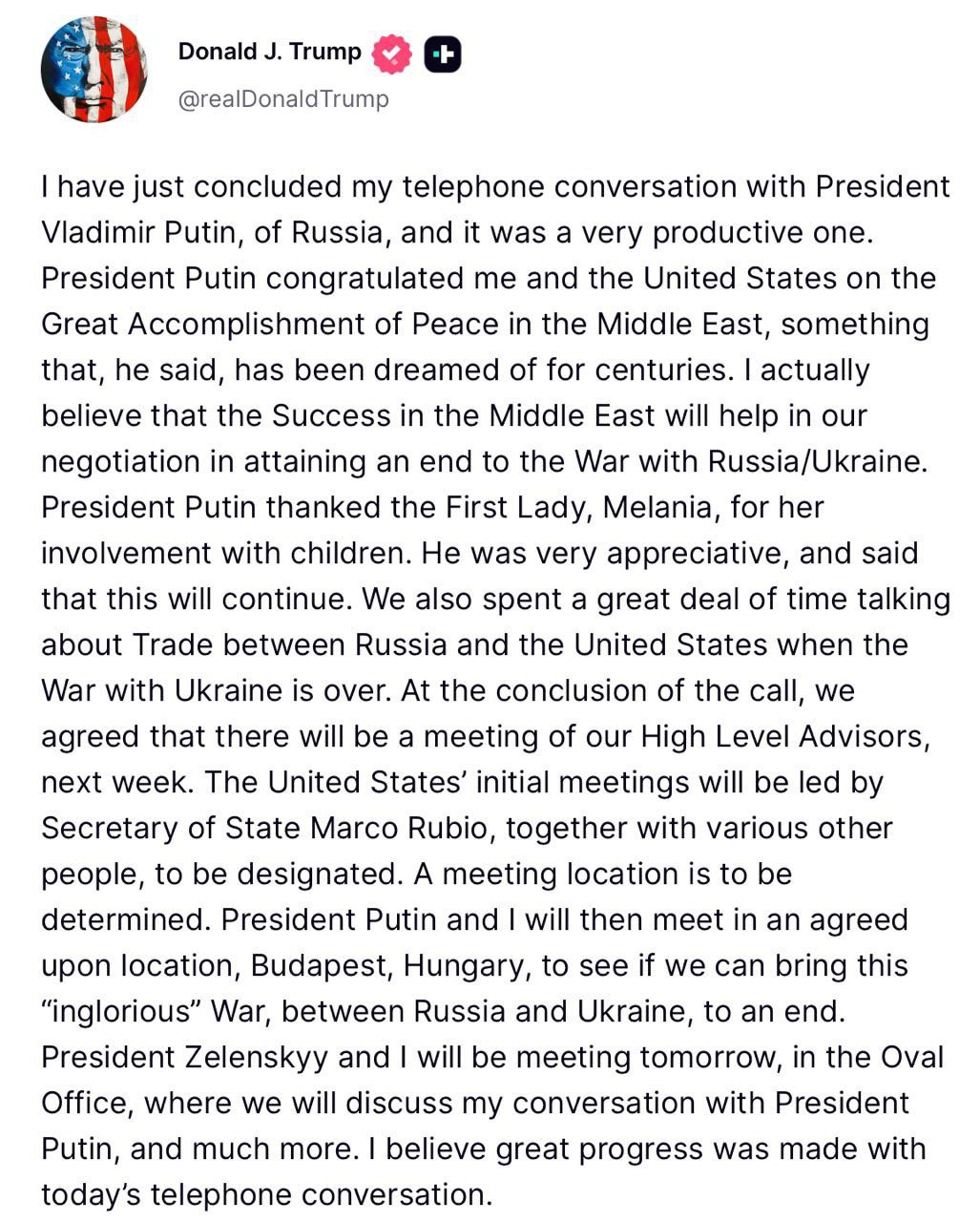 «Я только что завершил свой телефонный разговор с президентом России Владимиром Путиным, и он был очень продуктивным. Президент Путин поздравил меня и Соединенные Штаты с великим достижением — установлением мира на Ближнем Востоке, о чем, по его словам, мечтали веками. Я действительно верю, что успех на Ближнем Востоке поможет в наших переговорах по прекращению войны между Россией и Украиной. Президент Путин поблагодарил первую леди Меланию за ее участие в воспитании детей. Он был очень признателен и сказал, что так будет продолжаться и впредь. Мы также потратили много времени на обсуждение вопросов торговли между Россией и Соединенными Штатами после окончания войны с Украиной. В завершение телефонного разговора мы договорились, что на следующей неделе состоятся встречи наших советников высокого уровня. Первые встречи в Соединенных Штатах будут проходить под руководством госсекретаря Марко Рубио, а также ряда других лиц, которые будут назначены позднее. Место проведения встречи будет определено позднее. Затем мы с президентом Путиным встретимся в согласованном месте — в Будапеште, Венгрия, чтобы посмотреть, сможем ли мы положить конец этой «бесславной» войне между Россией и Украиной. Завтра я встречусь с президентом Зеленским в Овальном кабинете, где мы обсудим мой разговор с президентом Путиным и многое другое. Я считаю, что в ходе сегодняшнего телефонного разговора был достигнут значительный прогресс».