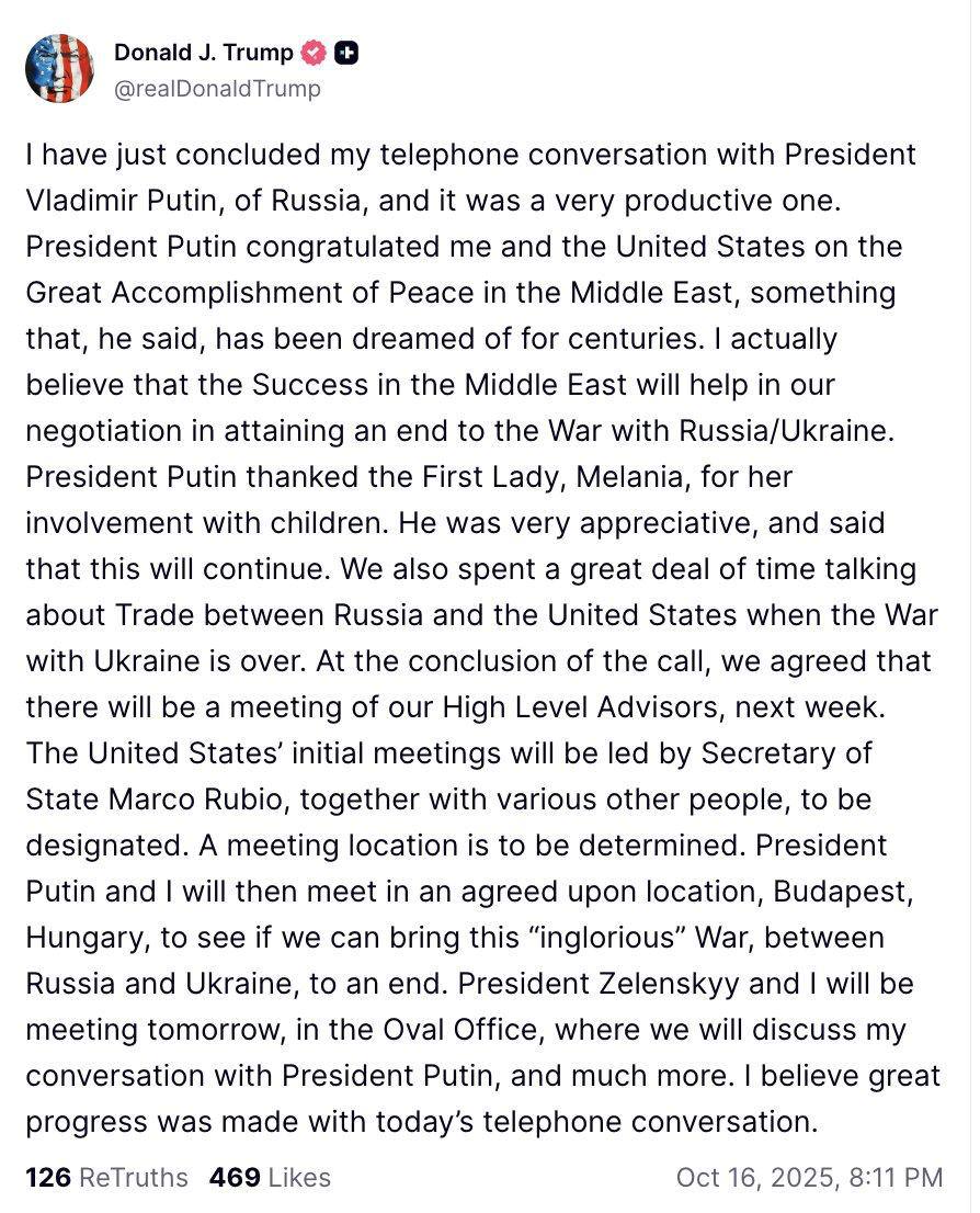 Трамп заявил, что встретится с Путиным в Будапеште после завершения встреч советников.