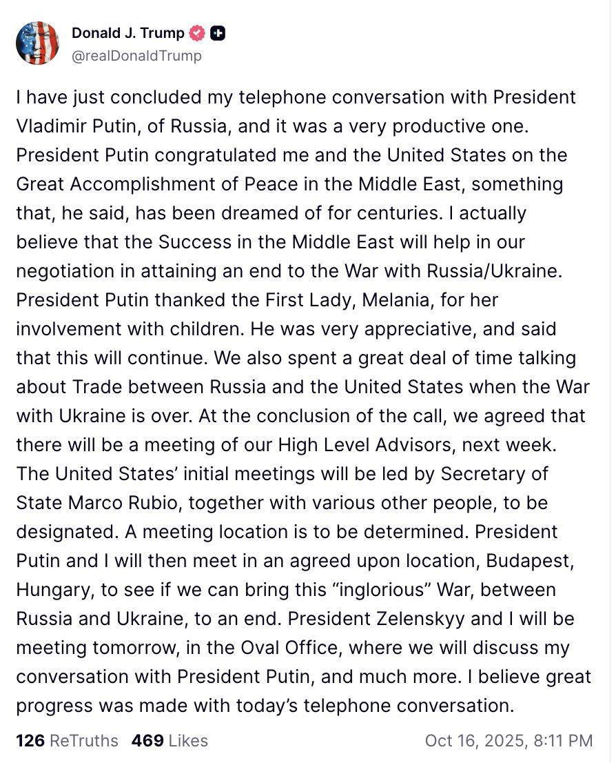 Трамп сообщил в соцсети Truth Social о состоявшемся телефонном разговоре с Владимиром Путиным, который он охарактеризовал как очень продуктивный. По словам американского лидера, российский президент поздравил его со «становлением мира на Ближнем Востоке», а также поблагодарил супругу Трампа Меланию за её благотворительную работу с детьми. Трамп выразил уверенность, что успех на Ближнем Востоке поможет в урегулировании конфликта между Россией и Украиной.