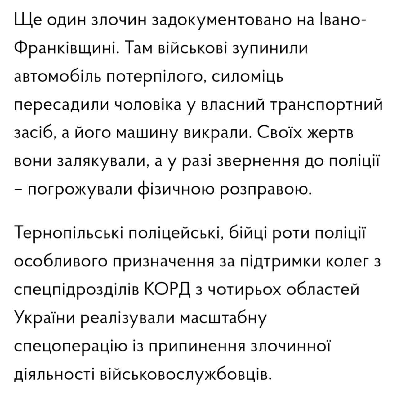 Тернопольские полицейские, бойцы роты полиции особого назначения при поддержке коллег из спецподразделений КОРД из четырех областей Украины реализовали масштабную спецоперацию по прекращению преступной деятельности военнослужащих.
