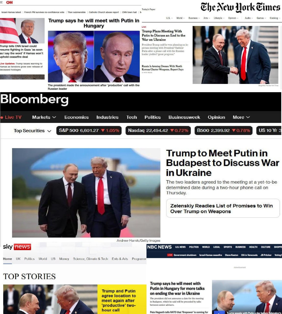 Новость о грядущей встрече Владимира Путина и Дональда Трампа в Венгрии мгновенно захватила внимание мировых СМИ. Естественно, все мгновенно забыли о запланированных переговорах президента США с украинским лидером — теперь в центре обсуждения исключительно предстоящий саммит.