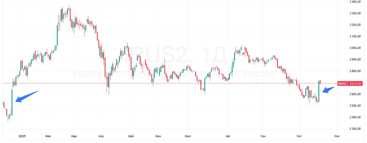 Индекс Мосбиржи (IMOEX2) по итогам торгов в четверг, 16 октября, взлетел на 6,97%, до 2716,58 пункта. Это лучший результат с декабря 2024 года, обратили внимание аналитики. 20 декабря, когда ЦБ внезапно сохранил ключевую ставку без изменений, индекс вырос на 8,8%, а 12 февраля 2025 года, когда состоялся первый телефонный разговор между главами России и США, рост был на уровне 5,78%.