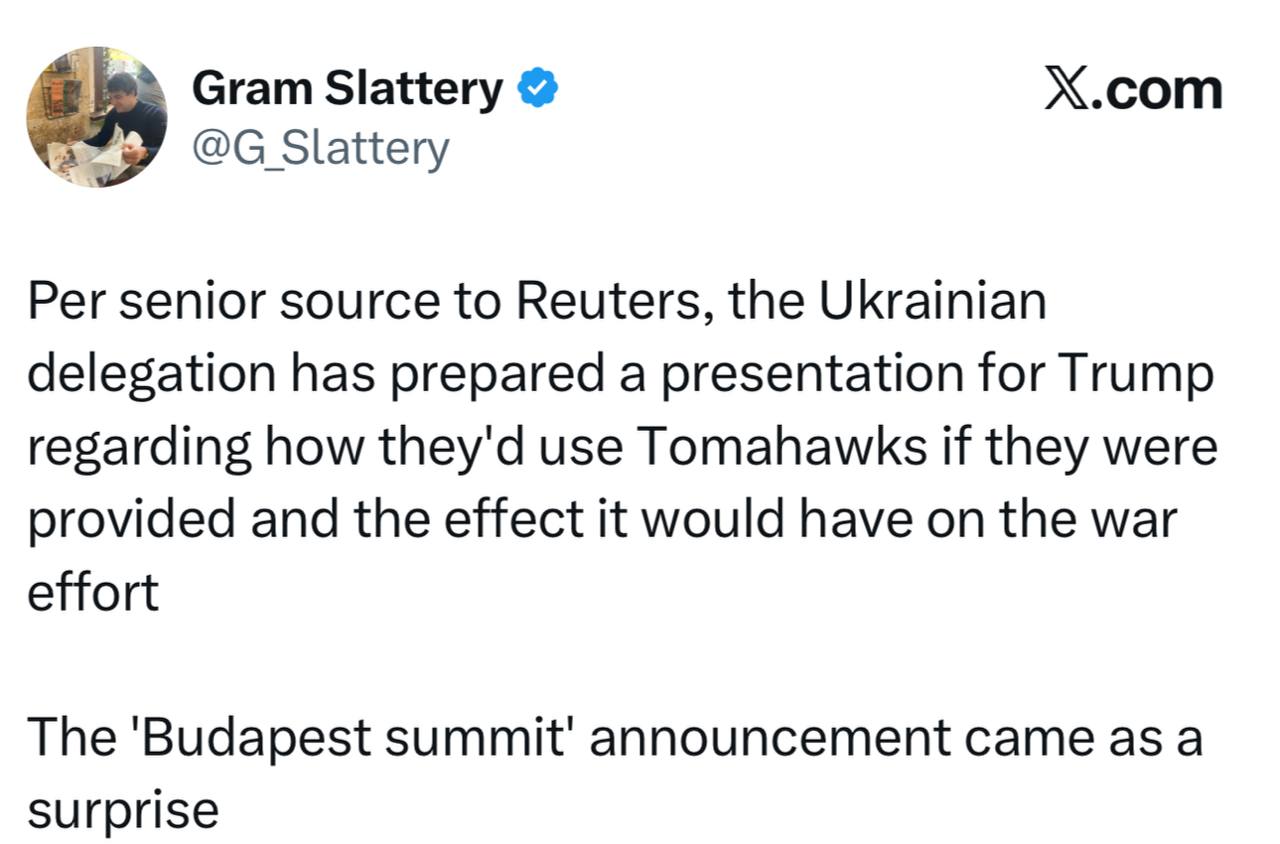 По словам источника Reuters, украинская делегация подготовила презентацию для Трампа о том, как они будут использовать «Томагавки», если их предоставят, и как это повлияет на военные усилия. Заявление о «Будапештском саммите» стало неожиданностью.