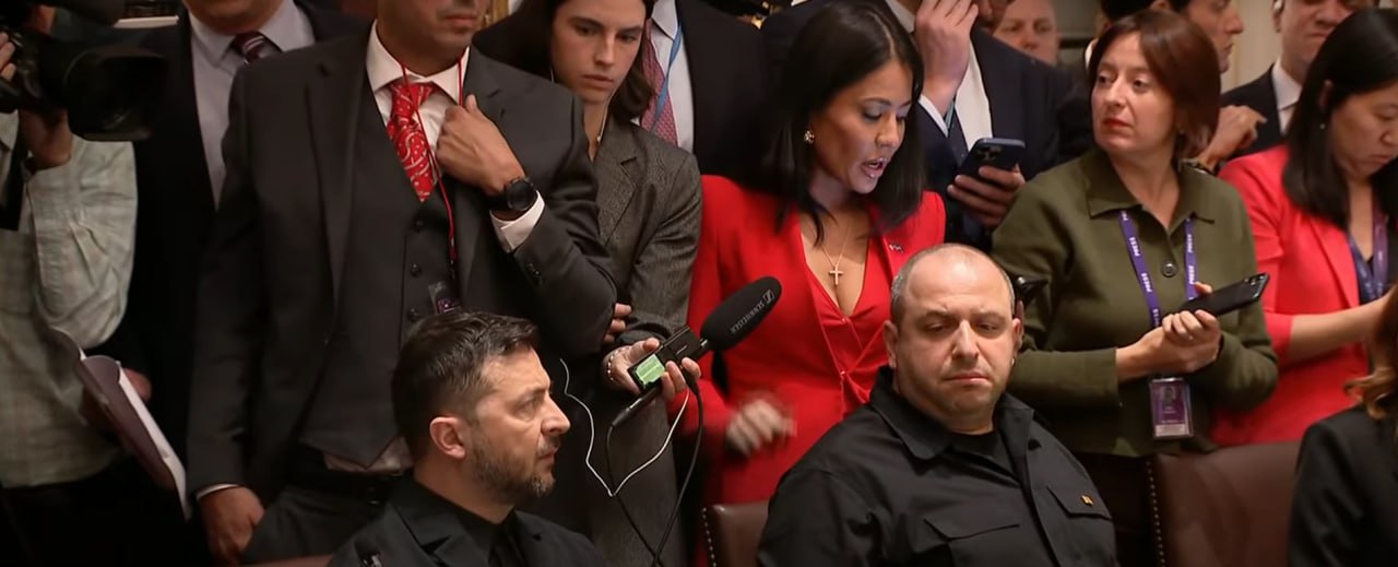 Очень интересно разместили журналистов: за спиной украинской делегации. Представители СМИ буквально нависают над Зеленским в попытках привлечь внимание Трампа.