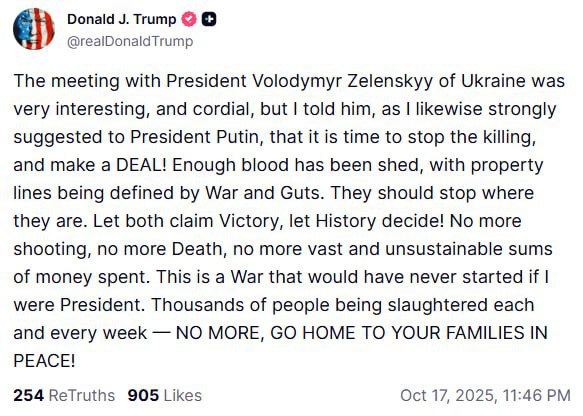 Трамп заявил, что Зеленскому пора заключить мирное соглашение с Путиным: «Они должны остановиться там, где находятся».