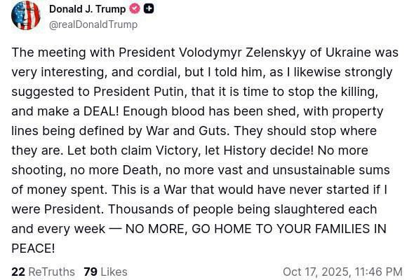 "Хватит стрельбы, больше никаких смертей, больше никаких огромных и непосильных трат. Эта война никогда бы не началась, если бы я был президентом. Тысячи людей гибнут каждую неделю — ХВАТИТ, ИДИТЕ ДОМОЙ К СВОИМ СЕМЬЯМ С МИРОМ!", - говорится в сообщении Трампа.