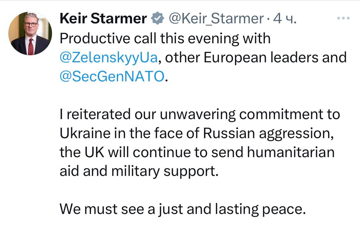 «Мы твёрдо намерены поддерживать Украину. Это подразумевает военную и финансовую помощь, гарантии безопасности, прекращение огня и мирный процесс»: