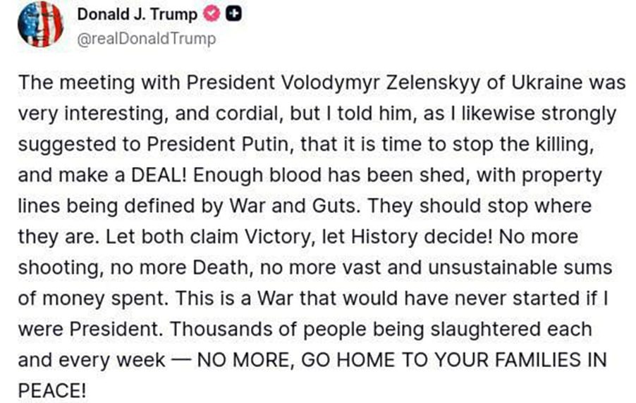 "Встреча с президентом Украины Владимиром Зеленским была очень интересной и сердечной, но я сказал ему, как я настойчиво предлагал президенту Путину, что пришло время прекратить убийства и заключить СДЕЛКУ! Уже пролито достаточно крови, границы собственности определяются войной и жестокостью. Они должны остановиться на достигнутом. Пусть оба заявляют о Победе, пусть решает история! Больше никакой стрельбы, никаких смертей, никаких огромных и непомерных трат денег. Это война, которая никогда бы не началась, будь я президентом. Тысячи людей гибнут каждый год. и каждую неделю, НЕ БОЛЬШЕ, ВОЗВРАЩАЙТЕСЬ ДОМОЙ К СВОИМ СЕМЬЯМ В МИР!" — этим сообщением в сети Truth Social Трамп подвёл краткий итог переговоров c Зеленским.