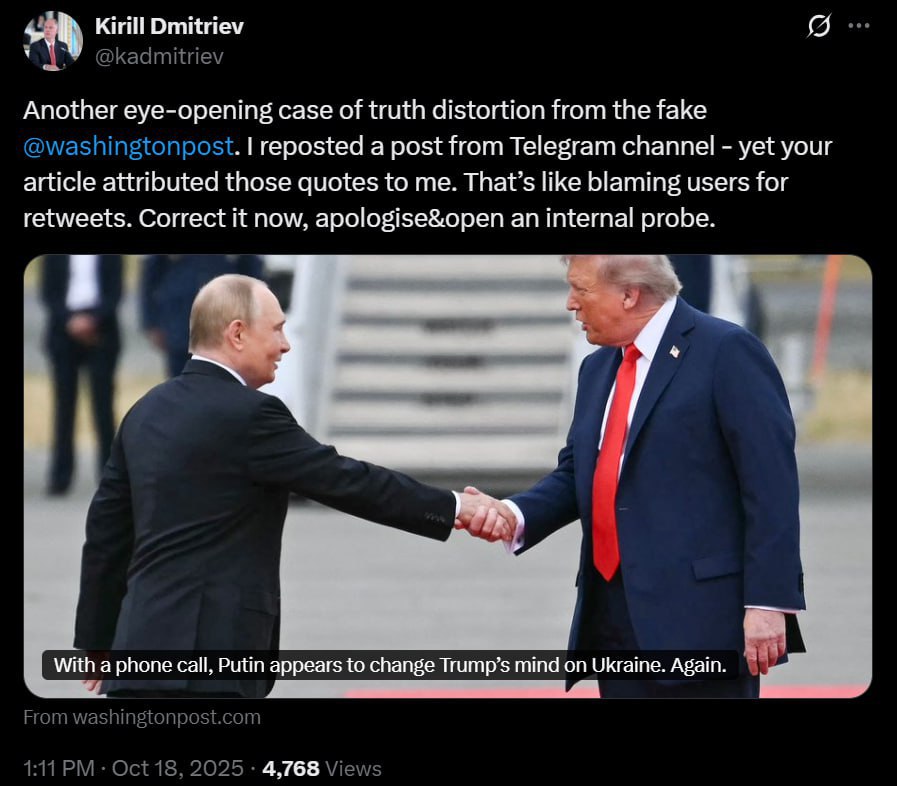 В статье от 18 октября The Washington Post опубликовала материал, где главе РФПИ приписали фразу "Турне Зеленского можно описать одной фразой: Путин снова переиграл всех".