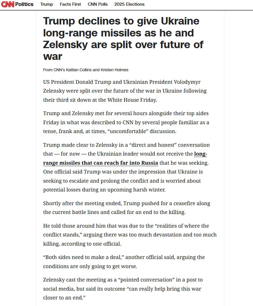 "В прямом и честном разговоре Трамп ясно дал понять Зеленскому, что пока украинский лидер не получит ракеты большой дальности, способные долететь до самых дальних уголков России, которых он просит. Один из чиновников заявил, что у Трампа сложилось впечатление: Украина стремится к эскалации и затягиванию конфликта"