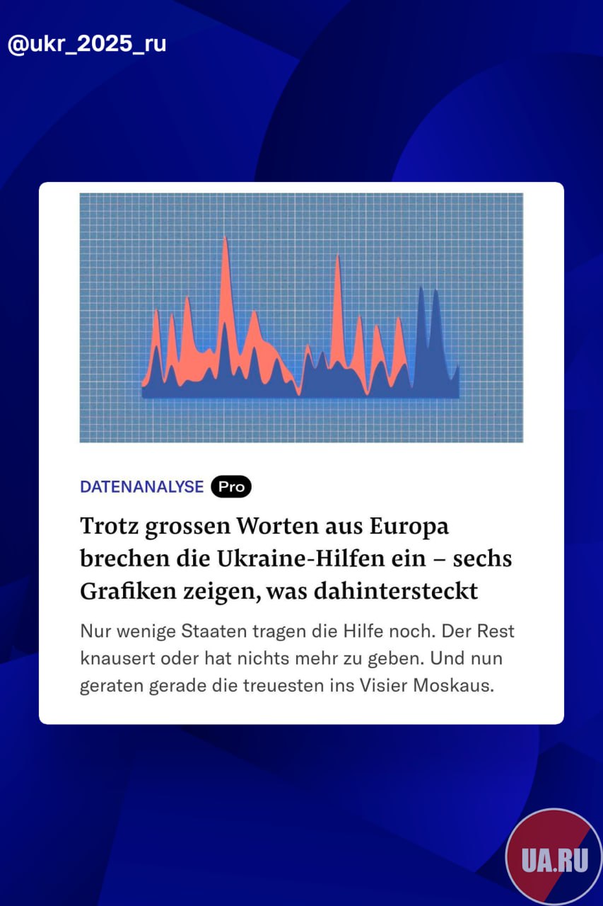 Объём европейской помощи сократился с 3,8 млрд евро до 1,9 млрд в месяц — падение на 57%. Отмечается, что ЕС не может производить достаточного количества вооружений, в том числе РСЗО, артиллерийские снаряды и ПВО.