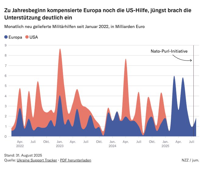 Как сообщает швейцарское издание NZZ, объем военной помощи Украине со стороны европейских стран продолжает сокращаться. Летние месяцы показали снижение европейских обязательств на 57% по сравнению с первой половиной года — с €3,8 млрд до €1,9 млрд в месяц.