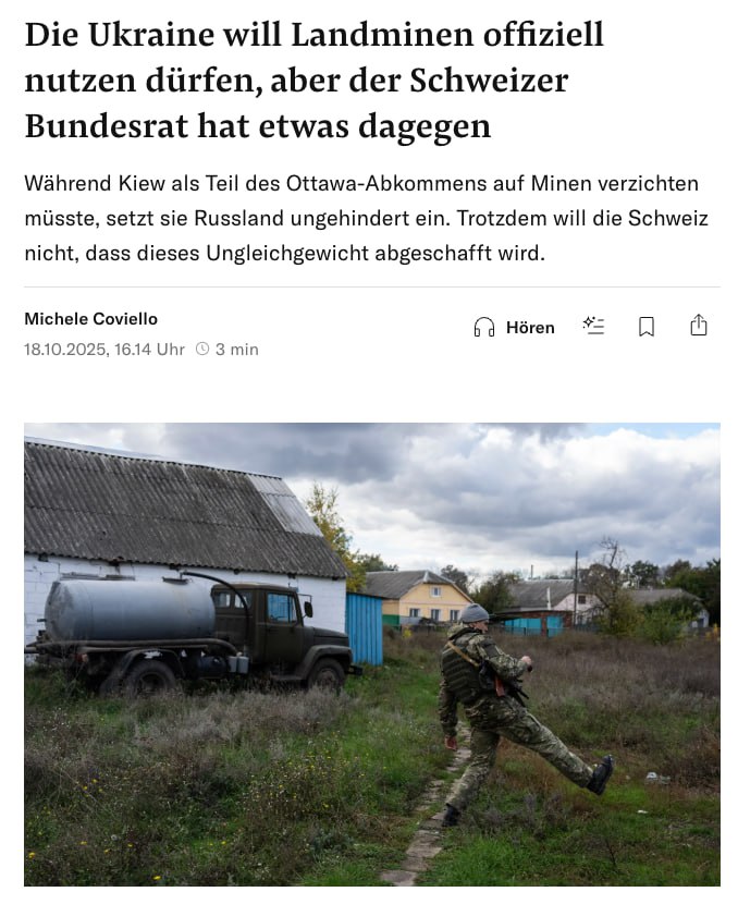 Как отмечает издание NZZ, Швейцария рассматривает данный вопрос с позиций международного права, выступая его гарантом. Федеральный совет подтвердил, что Украина обязана выполнять взятые на себя обязательства по Оттавской конвенции.