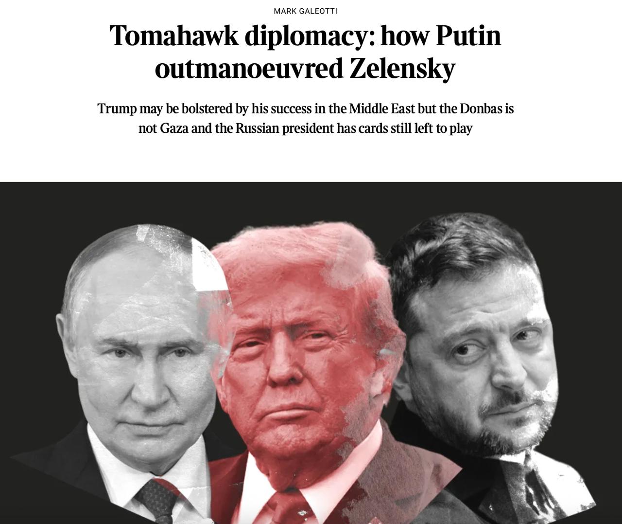 «Дипломатия Томагавков: как Путин переиграл Зеленского». Под таким заголовком один из главных в Британии «специалистов по России» Марк Галеотти опубликовал сегодня свою «аналитику» в The Sunday Times.