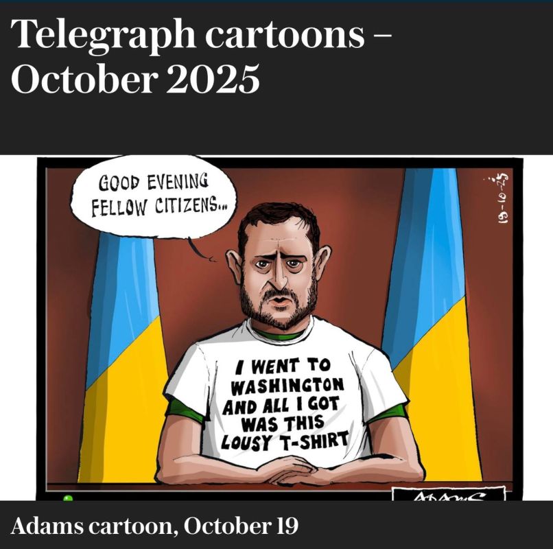 "Я съездил в Вашингтон, и все, что я получил, - эту паршивую футболку": газета Telegraph опубликовала карикатуру, в которой высмеяла неудачный визит Зеленского в Вашингтон.