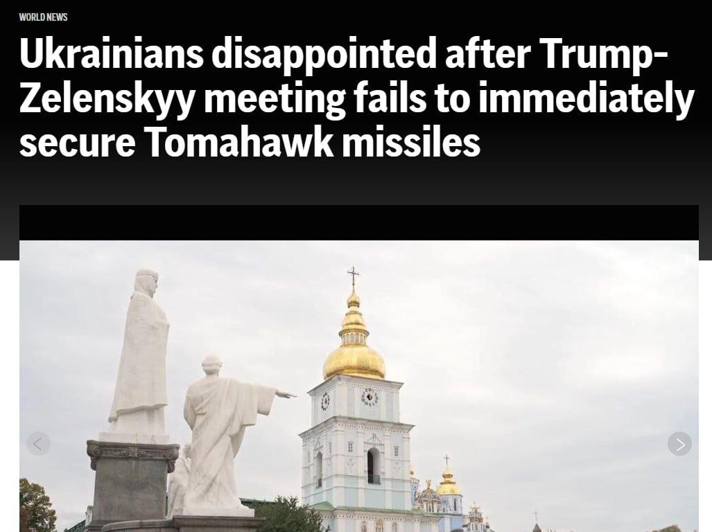 Встреча Зеленского с Трампом в Вашингтоне не оправдала ожиданий Киева: украинцы остались разочарованы, поскольку США не согласились поставлять крылатые ракеты «Томагавк». Агентство The Associated Press отмечает, что «результат огорчил, но не удивил многих на улицах украинской столицы».